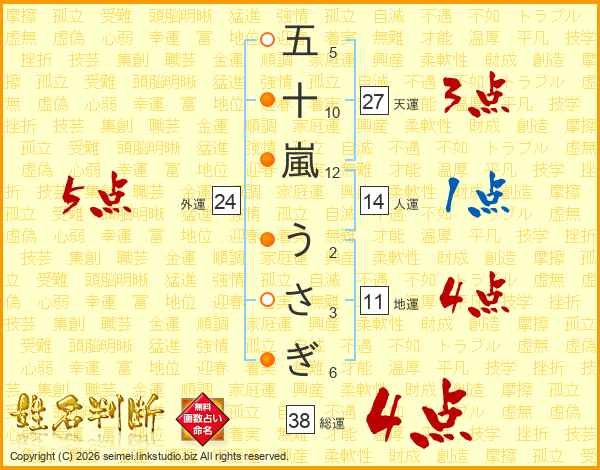 五十嵐うさぎさんの総運は38画の4点!