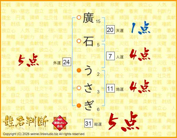 廣石うさぎさんの総運は31画の5点!