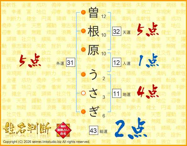 曽(12画)根(10画)原(10画) う(2画)さ(3画)ぎ(6画)