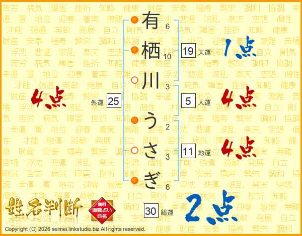 生活面を象徴する運勢です。外部から受ける影響力を表し、結婚運、家庭運や職場、環境への順応性を表します。総運から人運を引いた画数。姓や名が1文字の場合を除く。