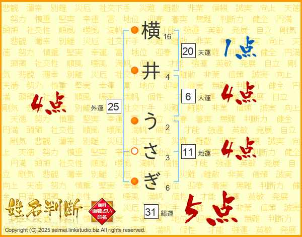 生活面を象徴する運勢です。外部から受ける影響力を表し、結婚運、家庭運や職場、環境への順応性を表します。総運から人運を引いた画数。姓や名が1文字の場合を除く。