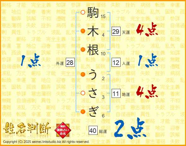 駒(15画)木(4画)根(10画) う(2画)さ(3画)ぎ(6画)