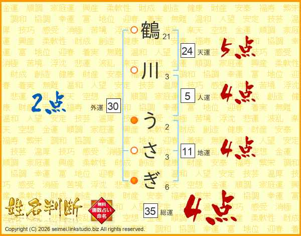 鶴川うさぎさんの総運は35画の4点!