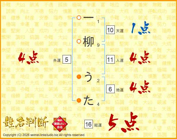 生活面を象徴する運勢です。外部から受ける影響力を表し、結婚運、家庭運や職場、環境への順応性を表します。総運から人運を引いた画数。姓や名が1文字の場合を除く。