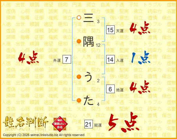 生活面を象徴する運勢です。外部から受ける影響力を表し、結婚運、家庭運や職場、環境への順応性を表します。総運から人運を引いた画数。姓や名が1文字の場合を除く。