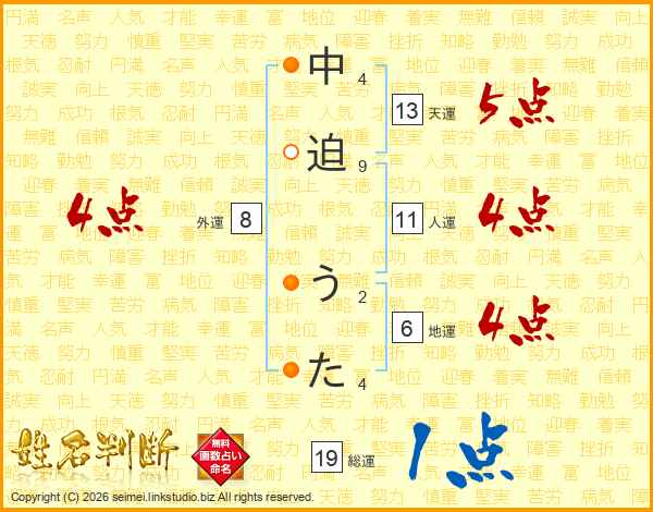 中迫うたさんの天運は13画の5点!