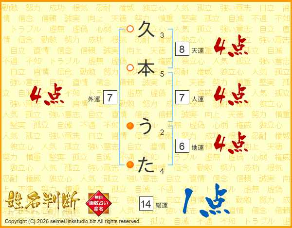 生活面を象徴する運勢です。外部から受ける影響力を表し、結婚運、家庭運や職場、環境への順応性を表します。総運から人運を引いた画数。姓や名が1文字の場合を除く。