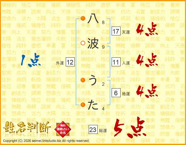 生活面を象徴する運勢です。外部から受ける影響力を表し、結婚運、家庭運や職場、環境への順応性を表します。総運から人運を引いた画数。姓や名が1文字の場合を除く。