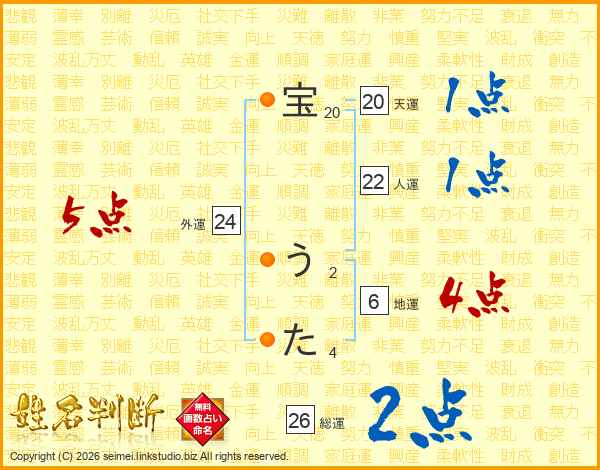 生活面を象徴する運勢です。外部から受ける影響力を表し、結婚運、家庭運や職場、環境への順応性を表します。総運から人運を引いた画数。姓や名が1文字の場合を除く。
