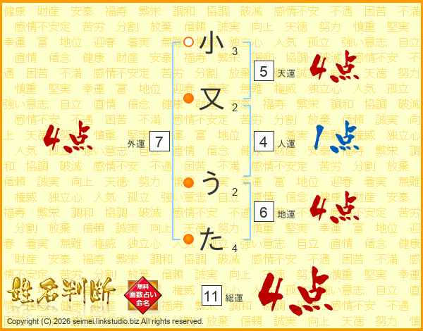 生活面を象徴する運勢です。外部から受ける影響力を表し、結婚運、家庭運や職場、環境への順応性を表します。総運から人運を引いた画数。姓や名が1文字の場合を除く。