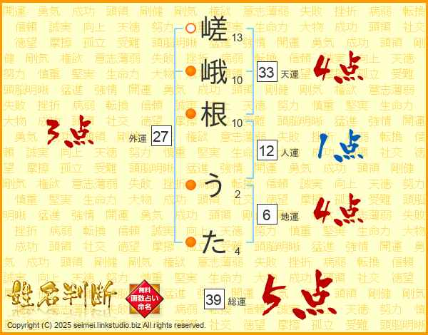 嵯(13画)峨(10画)根(10画) う(2画)た(4画)