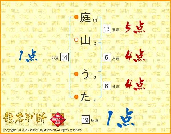 生活面を象徴する運勢です。外部から受ける影響力を表し、結婚運、家庭運や職場、環境への順応性を表します。総運から人運を引いた画数。姓や名が1文字の場合を除く。