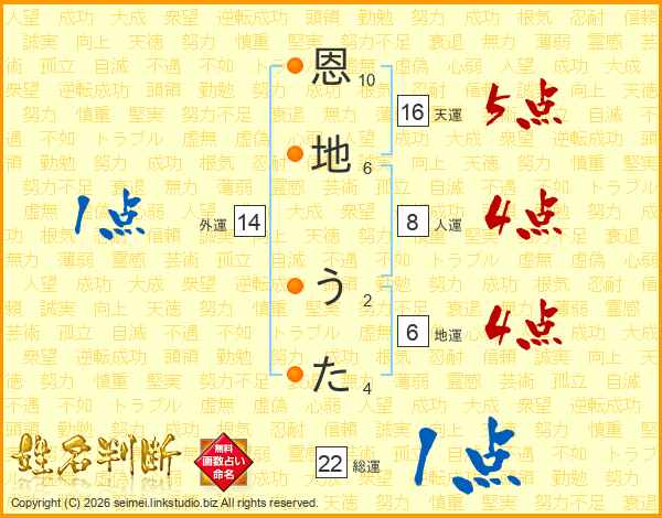 生活面を象徴する運勢です。外部から受ける影響力を表し、結婚運、家庭運や職場、環境への順応性を表します。総運から人運を引いた画数。姓や名が1文字の場合を除く。