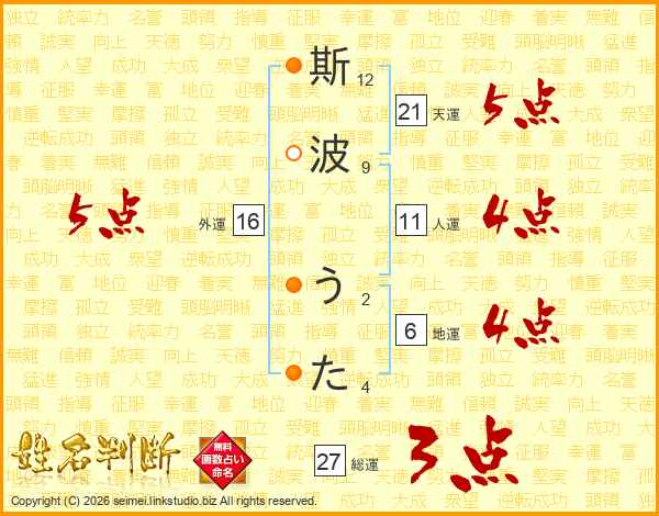 あなたの人生を表す1番重要な運勢です。生涯を通じて影響する総合運となり、主に50歳以降の晩年期に影響を及ぼします。苗字と名前の合計画数。