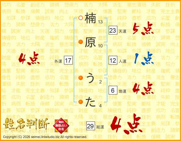 生活面を象徴する運勢です。外部から受ける影響力を表し、結婚運、家庭運や職場、環境への順応性を表します。総運から人運を引いた画数。姓や名が1文字の場合を除く。