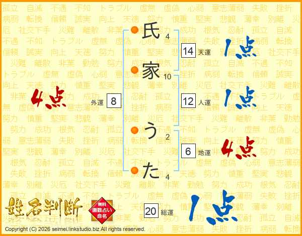 氏(4画)家(10画) う(2画)た(4画)