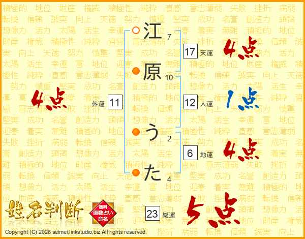 生活面を象徴する運勢です。外部から受ける影響力を表し、結婚運、家庭運や職場、環境への順応性を表します。総運から人運を引いた画数。姓や名が1文字の場合を除く。