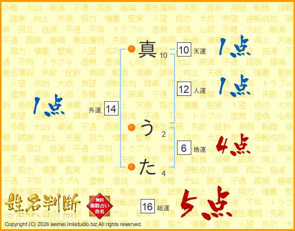 真うたさんの総運は16画の5点!