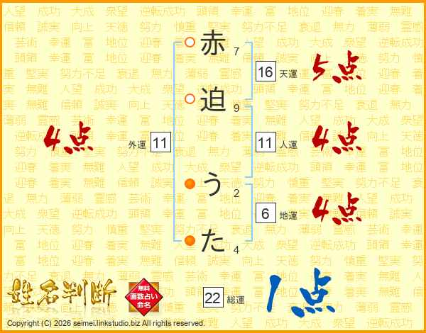 あなたの人生を表す1番重要な運勢です。生涯を通じて影響する総合運となり、主に50歳以降の晩年期に影響を及ぼします。苗字と名前の合計画数。