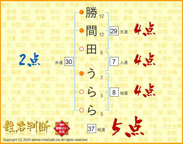 勝間田うららさんの総運は37画の5点!
