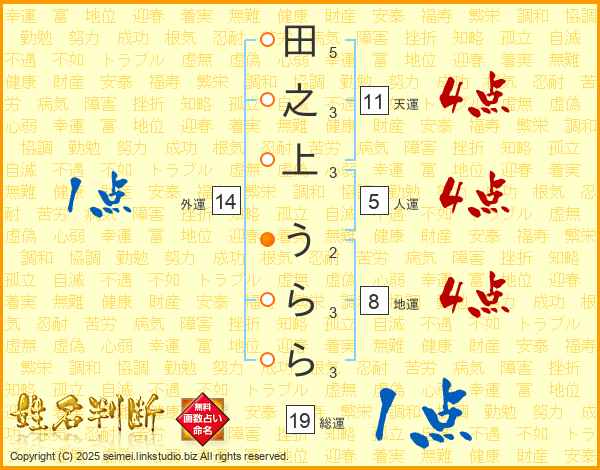 田(5画)之(3画)上(3画) う(2画)ら(3画)ら(3画)