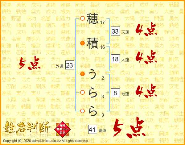 穂(17画)積(16画) う(2画)ら(3画)ら(3画)