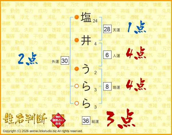 塩(24画)井(4画) う(2画)ら(3画)ら(3画)