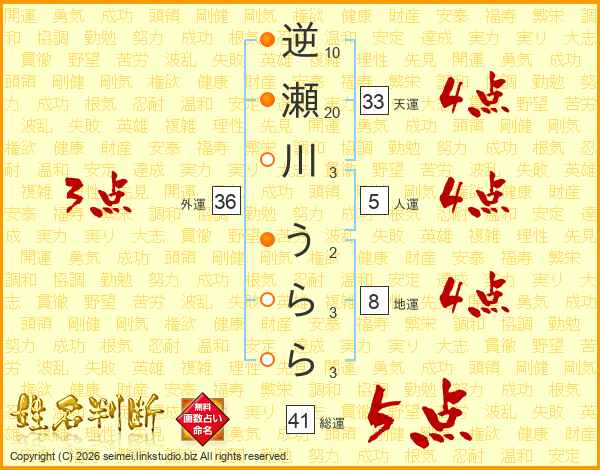 逆(10画)瀬(20画)川(3画) う(2画)ら(3画)ら(3画)