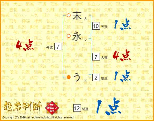 生活面を象徴する運勢です。外部から受ける影響力を表し、結婚運、家庭運や職場、環境への順応性を表します。総運から人運を引いた画数。姓や名が1文字の場合を除く。