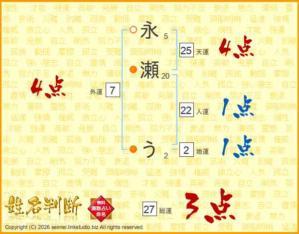 生活面を象徴する運勢です。外部から受ける影響力を表し、結婚運、家庭運や職場、環境への順応性を表します。総運から人運を引いた画数。姓や名が1文字の場合を除く。