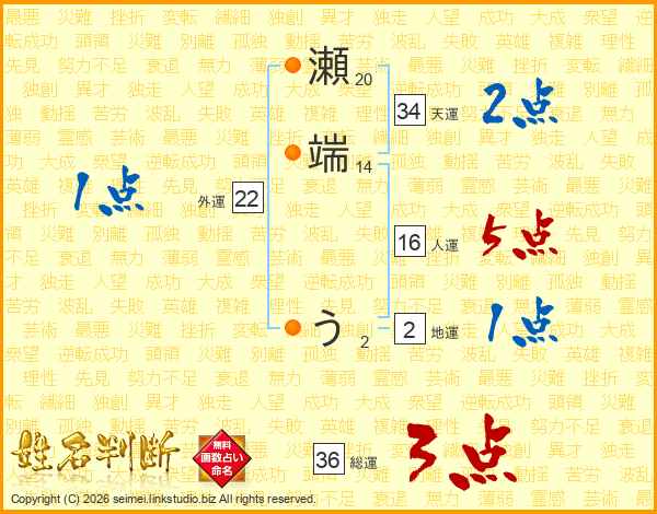 生活面を象徴する運勢です。外部から受ける影響力を表し、結婚運、家庭運や職場、環境への順応性を表します。総運から人運を引いた画数。姓や名が1文字の場合を除く。