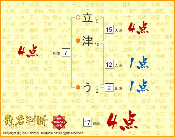 立津うさんの天運は15画の4点!