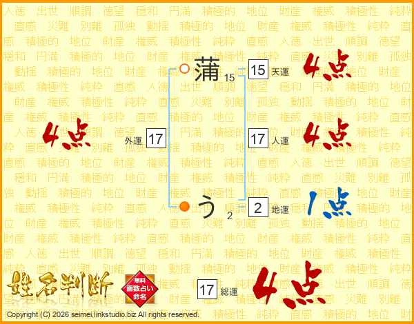 生活面を象徴する運勢です。外部から受ける影響力を表し、結婚運、家庭運や職場、環境への順応性を表します。総運から人運を引いた画数。姓や名が1文字の場合を除く。