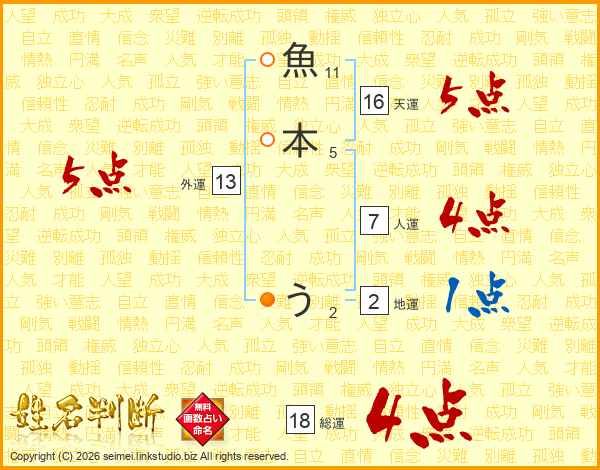 あなたの人生を表す1番重要な運勢です。生涯を通じて影響する総合運となり、主に50歳以降の晩年期に影響を及ぼします。苗字と名前の合計画数。