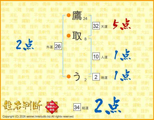 鷹取うさんの総運は34画の2点!