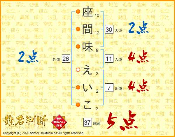 生活面を象徴する運勢です。外部から受ける影響力を表し、結婚運、家庭運や職場、環境への順応性を表します。総運から人運を引いた画数。姓や名が1文字の場合を除く。