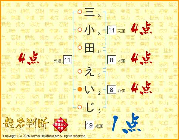 生活面を象徴する運勢です。外部から受ける影響力を表し、結婚運、家庭運や職場、環境への順応性を表します。総運から人運を引いた画数。姓や名が1文字の場合を除く。