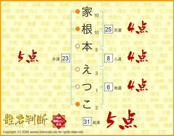 家(10画)根(10画)本(5画) え(3画)つ(1画)こ(2画)