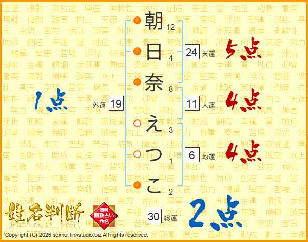 朝(12画)日(4画)奈(8画) え(3画)つ(1画)こ(2画)