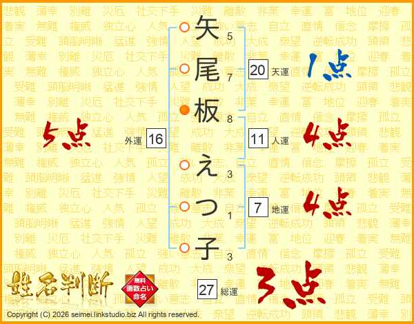 矢尾板えつ子さんの外運は16画の5点!