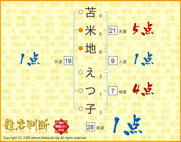 苫(9画)米(6画)地(6画) え(3画)つ(1画)子(3画)