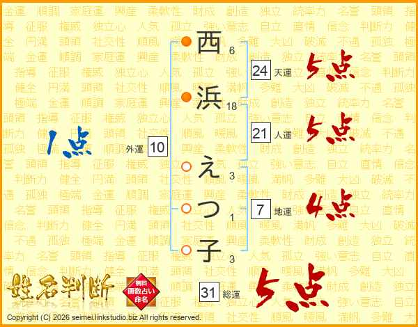 西(6画)浜(18画) え(3画)つ(1画)子(3画)