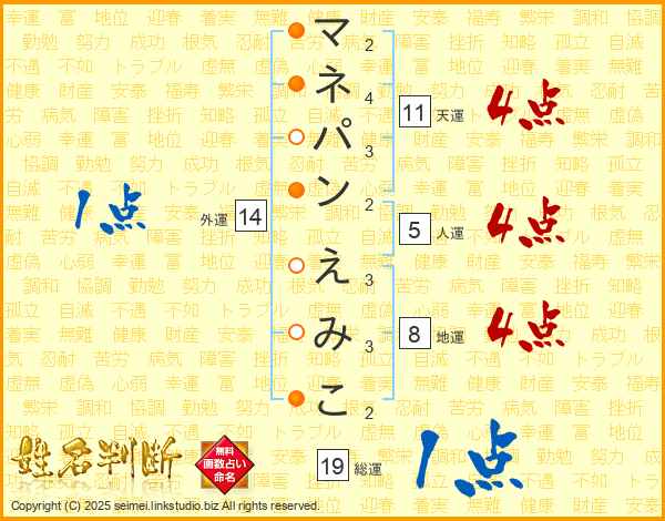 生活面を象徴する運勢です。外部から受ける影響力を表し、結婚運、家庭運や職場、環境への順応性を表します。総運から人運を引いた画数。姓や名が1文字の場合を除く。