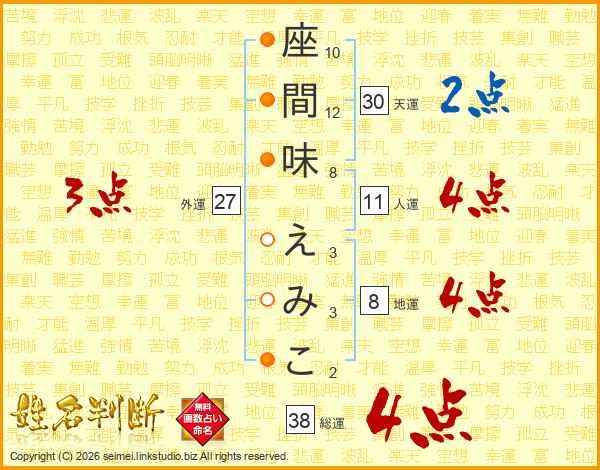 座間味えみこさんの総運は38画の4点!
