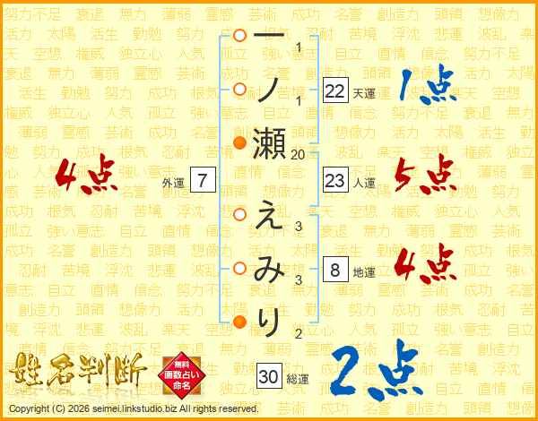 画数の奇数(○陽)と偶数(●陰)の配列で吉凶を占います。どちらかにかたよる名前は大凶名で避ける必要があります。画数の奇数偶数。