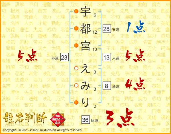 生活面を象徴する運勢です。外部から受ける影響力を表し、結婚運、家庭運や職場、環境への順応性を表します。総運から人運を引いた画数。姓や名が1文字の場合を除く。