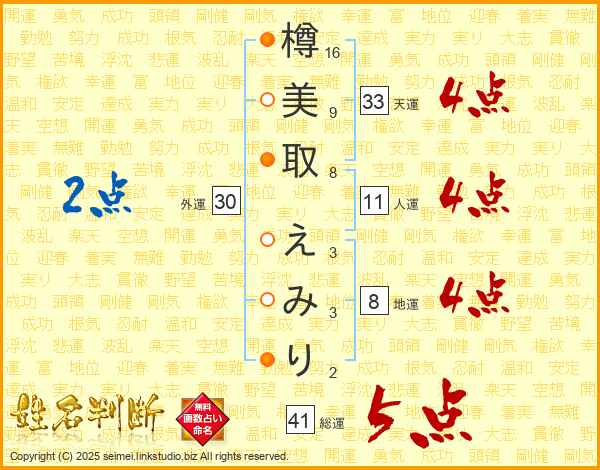 生活面を象徴する運勢です。外部から受ける影響力を表し、結婚運、家庭運や職場、環境への順応性を表します。総運から人運を引いた画数。姓や名が1文字の場合を除く。