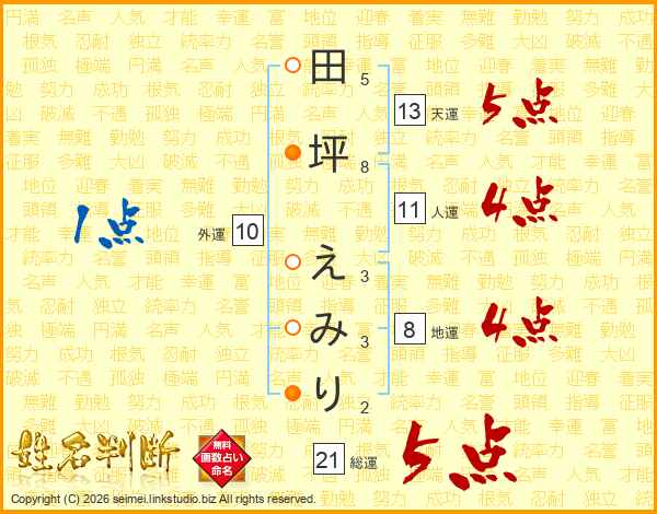 生活面を象徴する運勢です。外部から受ける影響力を表し、結婚運、家庭運や職場、環境への順応性を表します。総運から人運を引いた画数。姓や名が1文字の場合を除く。