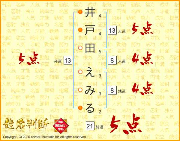 井戸田えみるさんの天運は13画の5点!