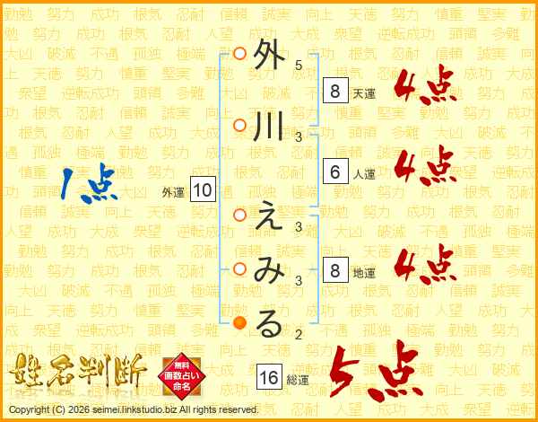 外川えみるさんの総運は16画の5点!